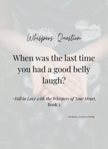 Whispers Question When was the last time you had a good belly laugh? ~Fall in Love with the Whispers of Your Heart, Book 3 When was the last time you had a laugh that took over your whole body? What were you doing? Who were you with? How might you welcome a moment like that…